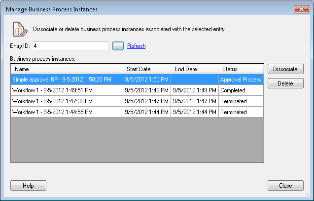 - The Manage Business Process Instances dialog box allows you to define an entry and delete or disassociate business process instances that are associated with it.