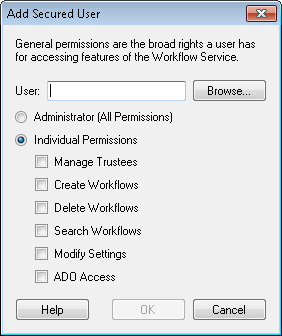 This node, under Security in the Workflow Administration Console, allows you to define the general permissions a user or group has for accessing Workflow features. You can also grant or deny rights to specific workflows.