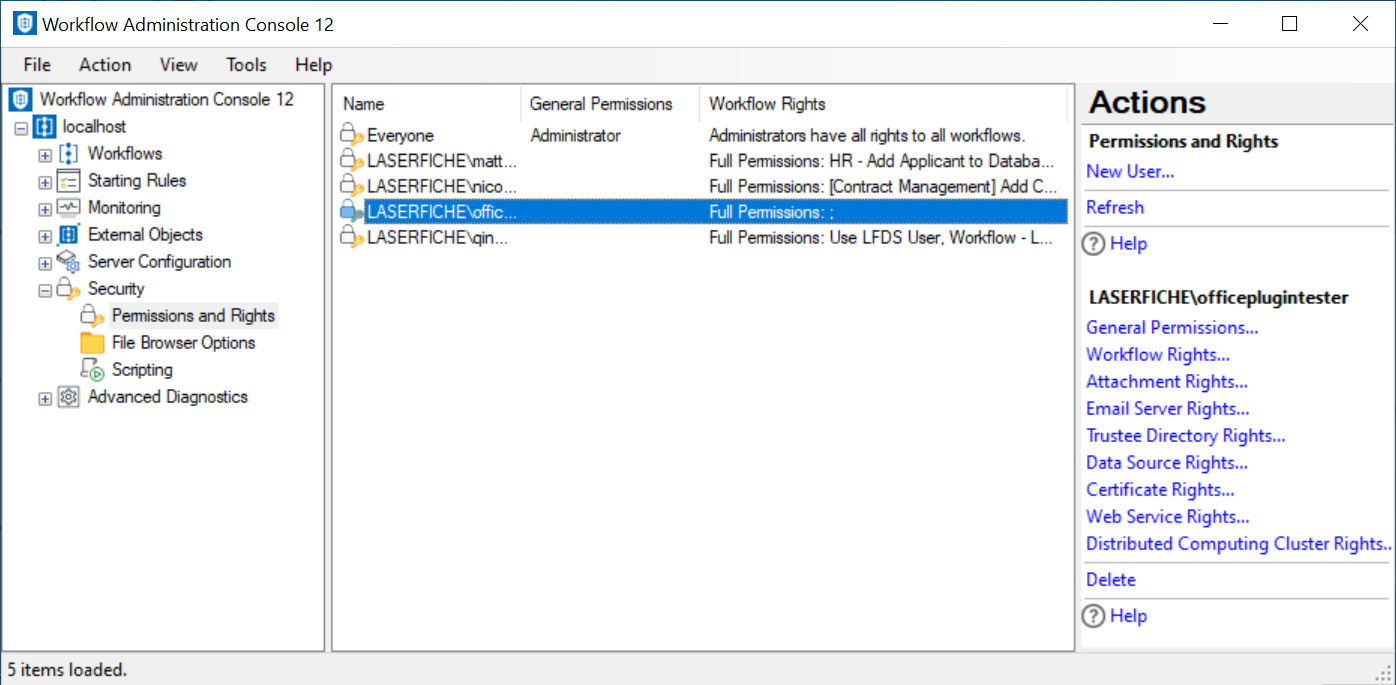 - Select Permissions and Rights. The node will list of all the Windows and Active Directory users configured to have Workflow permissions and rights.