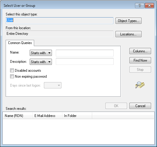 - Select Locations to define where the search should be performed (e.g., the local machine, across the active directory, a portion of the active directory).