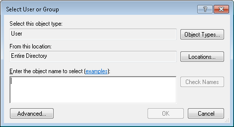 - Under Enter the object name to select, enter the name of an existing Windows or Active Directory user or group. Click examples to see the syntax that can be used.