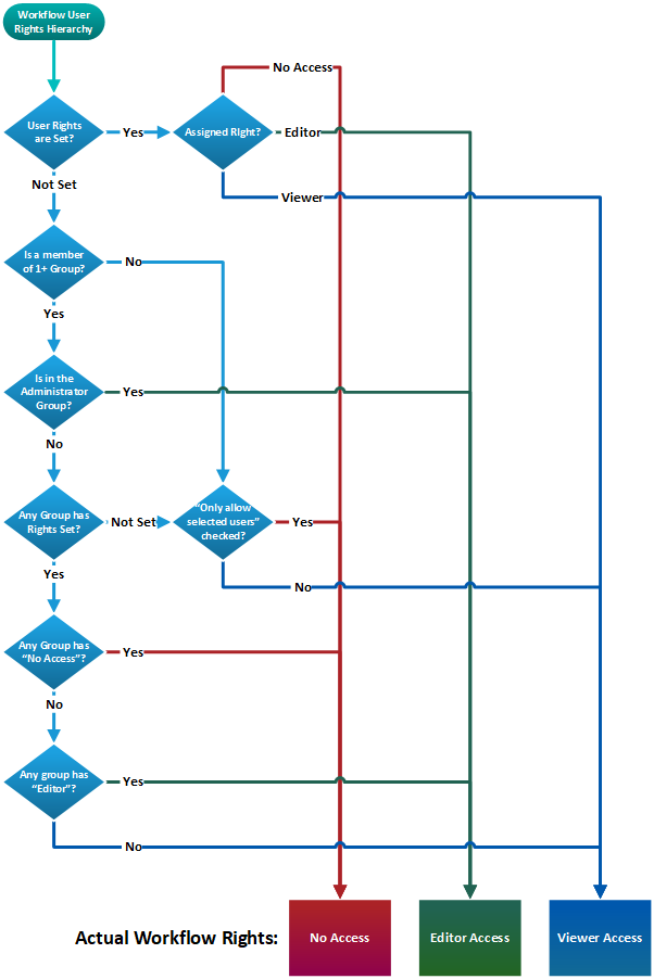 - If any group has No Access to a workflow, users in that group will have No Access regardless of any other group rights (except Administrators), and is the default if Only allow specified users to access the workflow has been selected in the workflow options dialog..