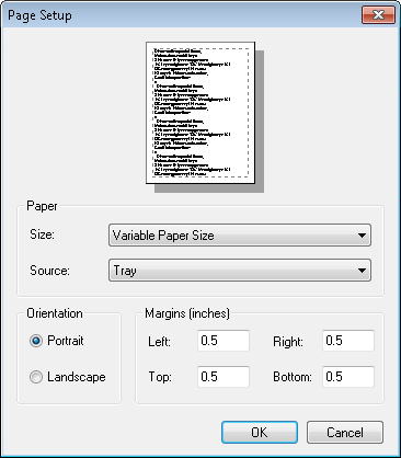 - Click Page Setup to specify a paper size, a paper source, the page orientation (portrait or landscape), and the margin sizes.