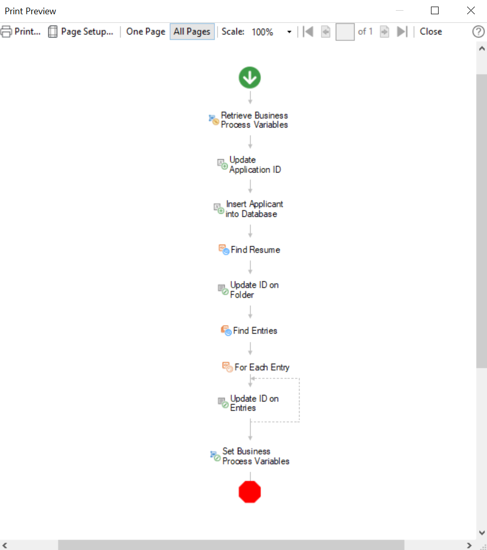 The Print Preview dialog box lets you view workflow or business process definitions, starting rules, search results, the Details tab, workflow statistics report, or workflow summary you are planning to print, before you print it. This allows you to see how it will look on the page and how many pages will be printed. Learn more about printing a workflow definition.