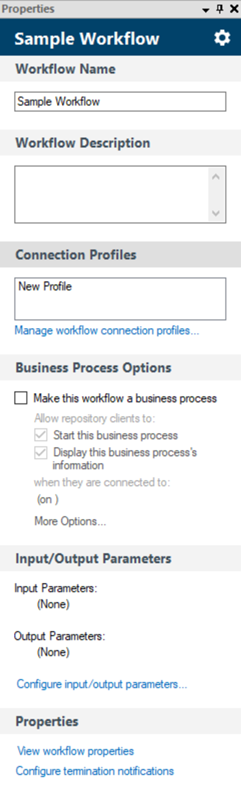- Select a blank spot in the Designer Pane. The Property Pane will display the following property boxes: Workflow Name, Workflow Description, Connection Profiles, Business Process Options, and Input/Output Parameters.