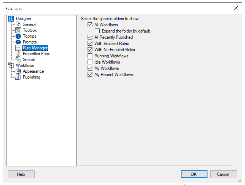 3. Select the checkboxes next to the folders you want to show in the Rule Manager. Clear the checkboxes next to the folders you want to hide in the Rule Manager. These folders will automatically update to contain the workflows with the same status as the folder name.