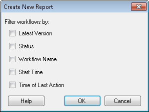 Create New Report dialog box, configure the search types to return the desired workflow statistics. When you select a search type, the dialog box will expand so that you can enter additional information. - Latest Version: Return only the latest version of each workflow in the search results.