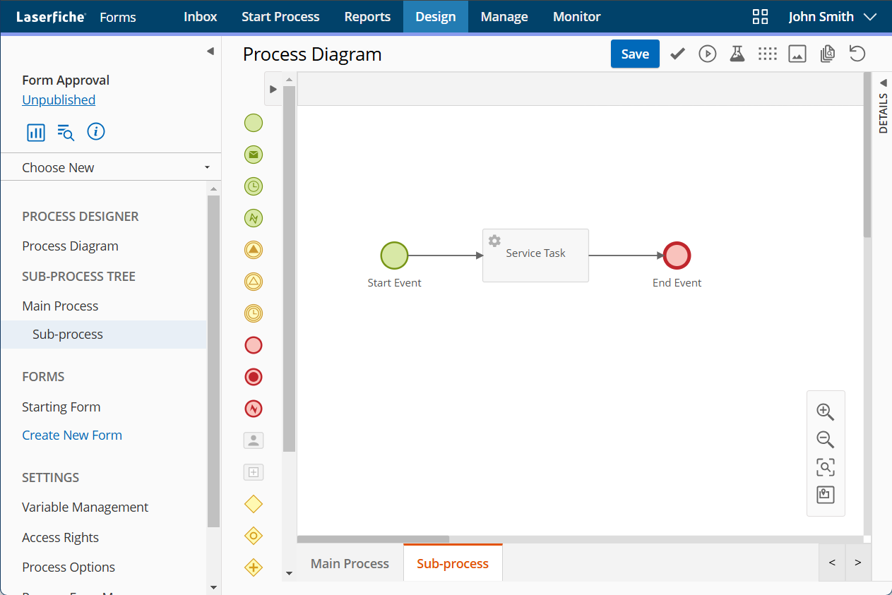 - Click the tab at the bottom of the canvas or in the pane on the left to open it. When you have many sub-processes, use the arrows to the right to scroll to a sub-process.