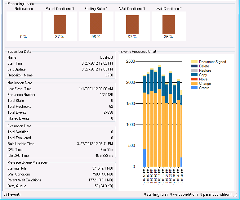 additional information about events occurring in the repository. - The tab displays Processing Loads charts, the Subscriber Data, the Notification Data, the Evaluation Data, the number and size of Message Queue Messages, and an Events Processed Chart.