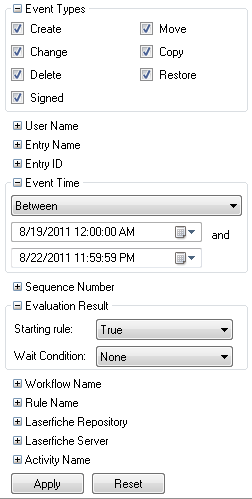 This pane allows you to search by Event Types, User Name, Entry Name, Entry ID, Event Time, Sequence Number, Evaluation Result, Workflow Name, Rule Name, Laserfiche Repository, Laserfiche Server, and Activity Name. Expand and configure the desired search types.- Click Apply to search.