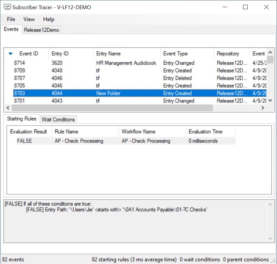 Tip: The status bar at the bottom of the Subscriber Tracer window shows, on the left, the number of events found and the number of events hidden by the filter (filtered). On the right, it shows the number of starting rules, wait conditions, and parent conditions (conditions that use a parent entry such as parent name, parent path, parent folder/document count, and parent folder contents) and, in parentheses, the average amount of time it took for each of these types of conditions to be evaluated.