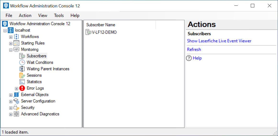 This node, under Monitoring in the Workflow Administration Console, lets you view and delete the subscribers monitoring the Laserfiche Server. You can also view the Subscriber Trace Log and the Laserfiche Live Event Viewer from this node.