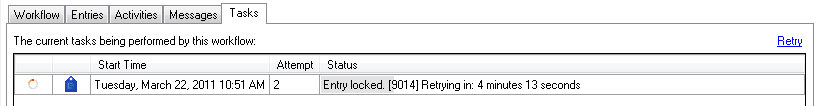 Tasks tab lists tasks the workflow instance is currently performing. (A task is an activity that has the potential to be long-running such as searching a repository, sending an e-mail, or retrieving data from a database.) If the workflow instance encounters a locked entry, this tab will show a countdown to when the activity will retry accessing the entry.