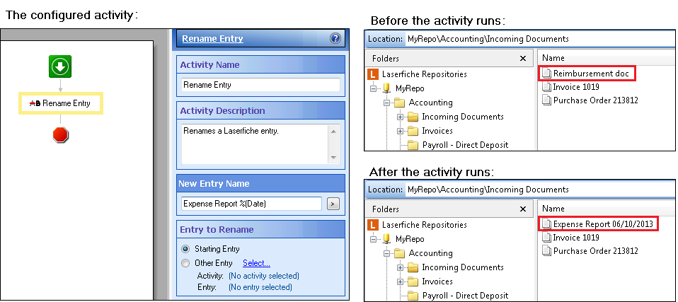 Example: The Rename Entry activity renames an entry. You can use tokens to dynamically assign the entry's new name. If you configure this activity to rename the entry using the date token %(Date), the entry will be renamed according to the date the workflow ran.