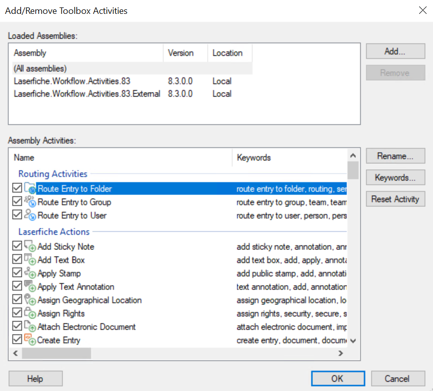 Add/Remove Toolbox Activities dialog box. - The Loaded Assemblies box shows you the assemblies where the available activities are stored. The Laserfiche.Workflow.Activities.83 and Laserfiche.Workflow.Activities.83.External assemblies contain the activities for Workflow 12.0.
