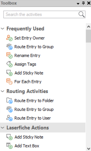 - Type in an activity name or a keyword in the Search the activities text box at the top of the Toolbox Pane. The list of activities will automatically narrow down to match your search term as you type in the search box. Click the red X