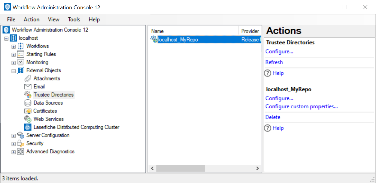 This node, under External Objects in the Workflow Administration Console, lets you view, add, modify, and delete trustee directories that are configured to work with workflows on the Workflow Server. Workflow can interact with any Laserfiche, LDAP, or Laserfiche Directory Server trustee directories that appear in this node.