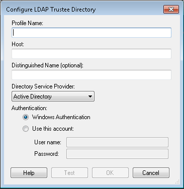 Configure LDAP Trustee Directory dialog box, under Profile Name, type a name for the trustee directory you are about to configure. Users will see this name in the Trustee Provider list in the Workflow Designer. - Under Host, type the domain where the trustees are located. By default, Workflow will connect over the standard LDAP port of 389. To have Workflow use an alternative port, append ":portNumber" to the Host value. To use LDAPS (encrypted LDAP), specify port 636 (standard LDAPS port), e.g., "example.com:636".
