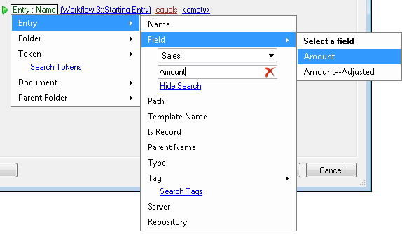 . - Multi-value tokens on the right side of a condition are treated the same as they are in most other text boxes in Workflow; the first value of the token will be used unless an index is specified.