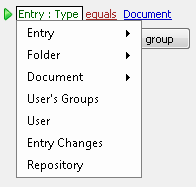 - Condition Type: Click these links to specify what type of entry, user, repository, or token the condition will concern. Point to some of the items in the menu to see more options, which can help you specify exactly which entries or tokens you want the conditions to apply to. Learn more about the Condition Type options.