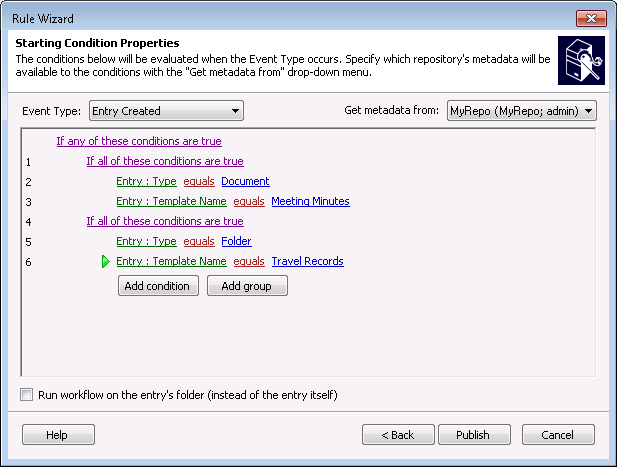 Example: Laura wants her workflow to run if a document is created with the "Meeting Minutes" template or a folder is created with the "Travel Records" template. She specifies that she wants her workflow to run if either of these conditions are met by changing the group text at the top of the condition editor to say If any of these conditions are true. Then she creates two groups of conditions that both use the If all of these conditions are true option. Group one specifies that the Entry Type must be a Document and the Entry Template Name must be "Meeting Minutes." Group two specifies that the Entry Type must be a Folder and the Entry Template Name must be "Travel Records." If a document with the "Meeting Minutes" template or a folder with the "Travel Records" template is created, then the workflow will run.