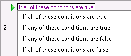 - Group: Click this link to choose if all the conditions in the group must be true, if any of the conditions must be true, if any of the conditions must be false, or if all the conditions must be false.