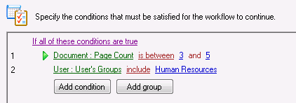 Example: Kathy's workflow has a starting rule that is satisfied when someone creates a document in the "Human Resources" folder and if the document has more than ten pages. Originally, she had her conditions organized so that Workflow first checked if created documents had more than ten pages and then checked if a document was created in the "Human Resources" folder. Because her company has so many workflows and such a high document volume, performance is important. By switching her two conditions, Workflow can evaluate her starting rule more quickly.