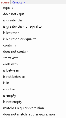 - Operator: Click these links to specify the logic of the condition: the relationship between the item specified in the condition type text and the value entered to the right. The operators available in this list depend on the condition type text.