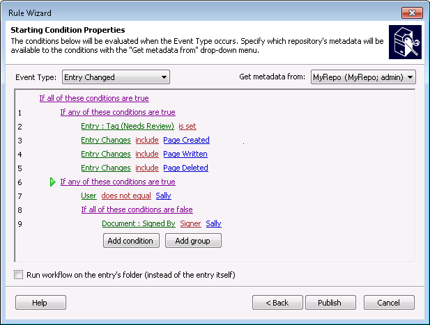 Example: Robert created a workflow that will run when a document has a page added, deleted, or changed, or if the "Needs Review" tag was set on the document. He creates a group that specifies that any of the following conditions must be true: the Entry Change event was Page Created, Page Written (when a page is edited, such as when a scanned image is replaced), or Page Deleted, or the Entry Tag" Needs Review" is set. However, he does not want the workflow to run if Sally made any of the above changes to the document and signed it. To account for this exception, Robert creates another group of conditions under the option If any these conditions are true. The first condition in the group is that the User who changed the entry was not Sally. The second condition, configured in a sub-group, specifies that Sally did not sign the document. He places both main groups of conditions under the condition that the workflow will run If all these conditions are true.