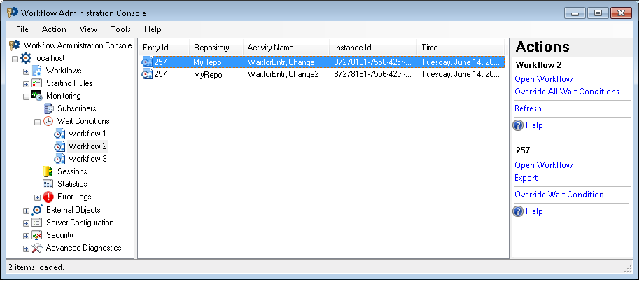 This node, under Monitoring in the Workflow Administration Console, lets you view information about, and interact with, wait conditions. The node shows active wait conditions, the ID number of the entry they are interacting with, the repository the entry is in, the name of the waiting activity, the workflow's instance ID, and the time they started waiting.