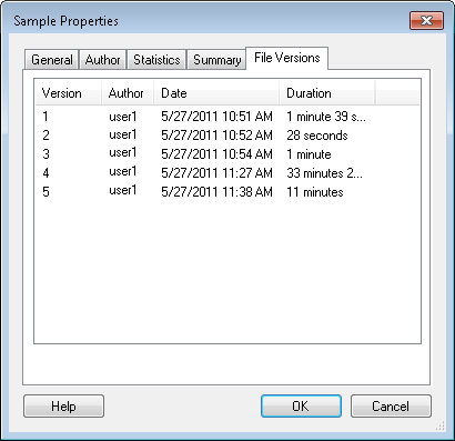 - File Versions: This tab list the file version of the workflow, the user that created or updated the file, when the file was created, and how long each version of the file existed before it was updated. A new version is created every time a workflow file .wfx is saved.