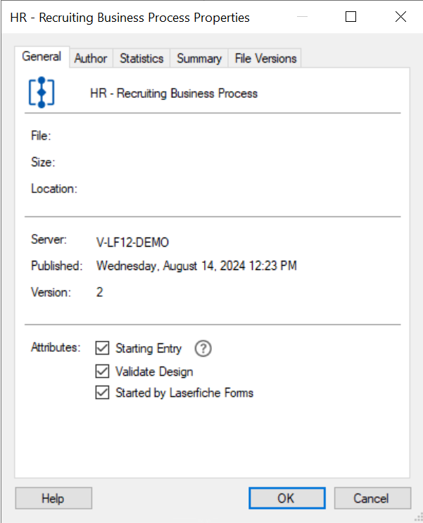 - General: This tab displays the file name, size, location, server, published date, and version of the workflow. You can change the following attributes of the workflow from this tab.