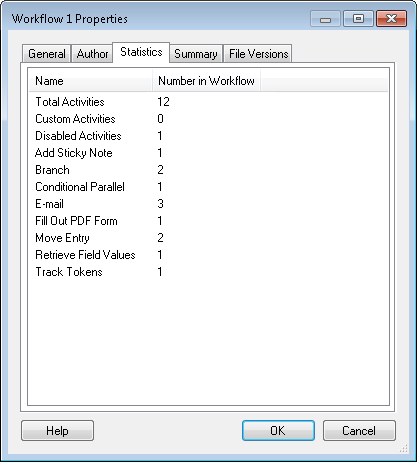 tab displays when the number of activities (by activity type) in the workflow. - Summary: This tab displays a summary of the workflow and each of the activities in the workflow. The summary describes how the workflow and each activity are configured.