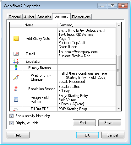 - When viewing summaries as a table or as text, select Show activity hierarchy to indent activities that are contained inside other activities. Selecting this option will organize the activities to reflect how they appear in the workflow.