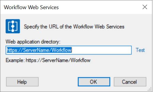 Workflow Web Service dialog box: - Workflow will automatically populate the Web application directory field with a URL that contains the name of the server.
