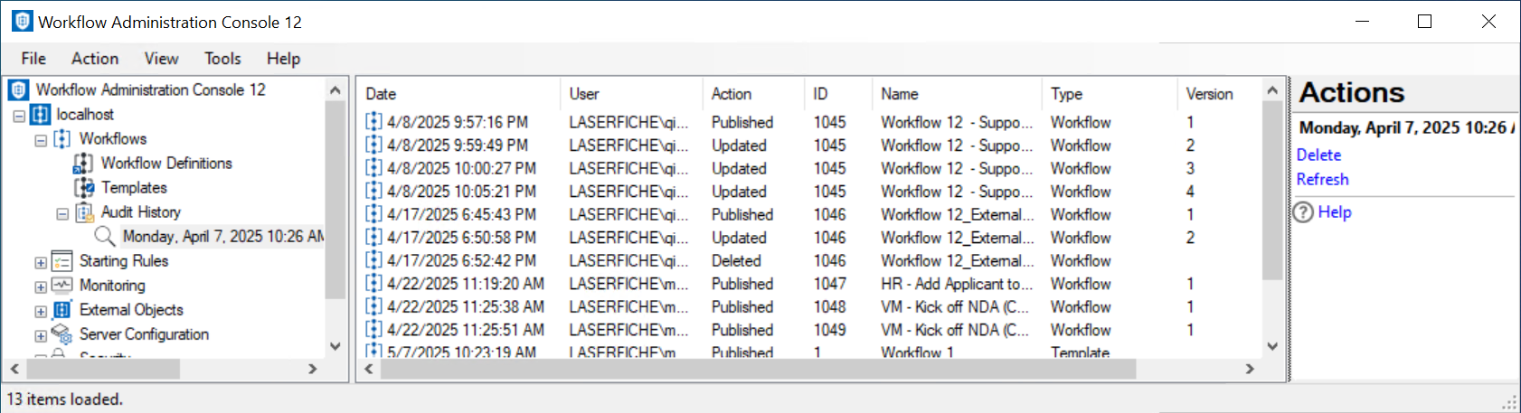 - In the center Details Pane, a list of each time a workflow was updated, published, or deleted will appear. For each event, the audit history will list the: