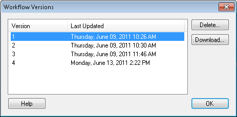 - The Workflow Versions dialog box will display a list of the versions of the workflow definition and when they were last updated.