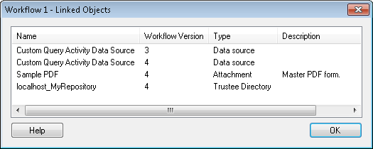 - The Linked Objects dialog box will display the name of the linked object, the workflow version it is linked to, the type of object it is, and the object's description.