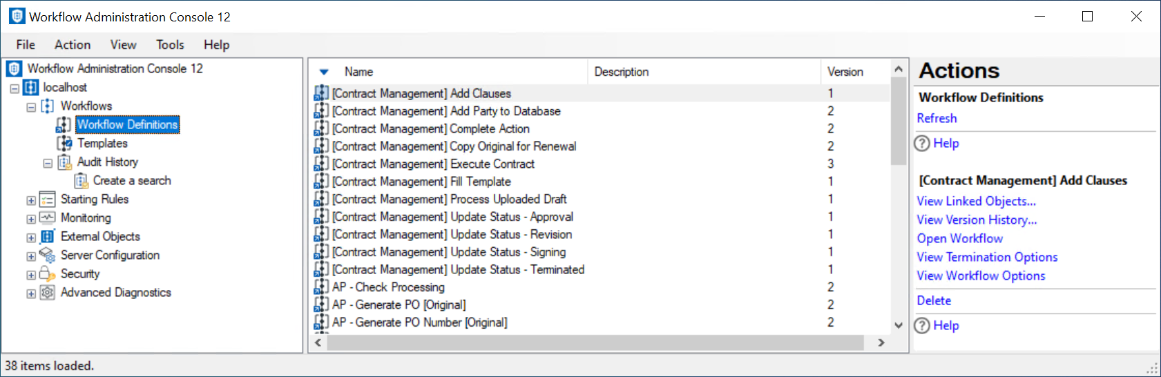 Tip: You can refresh this list to reflect recent changes by clicking the Refresh link below Workflow Definitions in the Actions Pane. Alternatively, right-click the Workflow Definitions node and select Refresh.