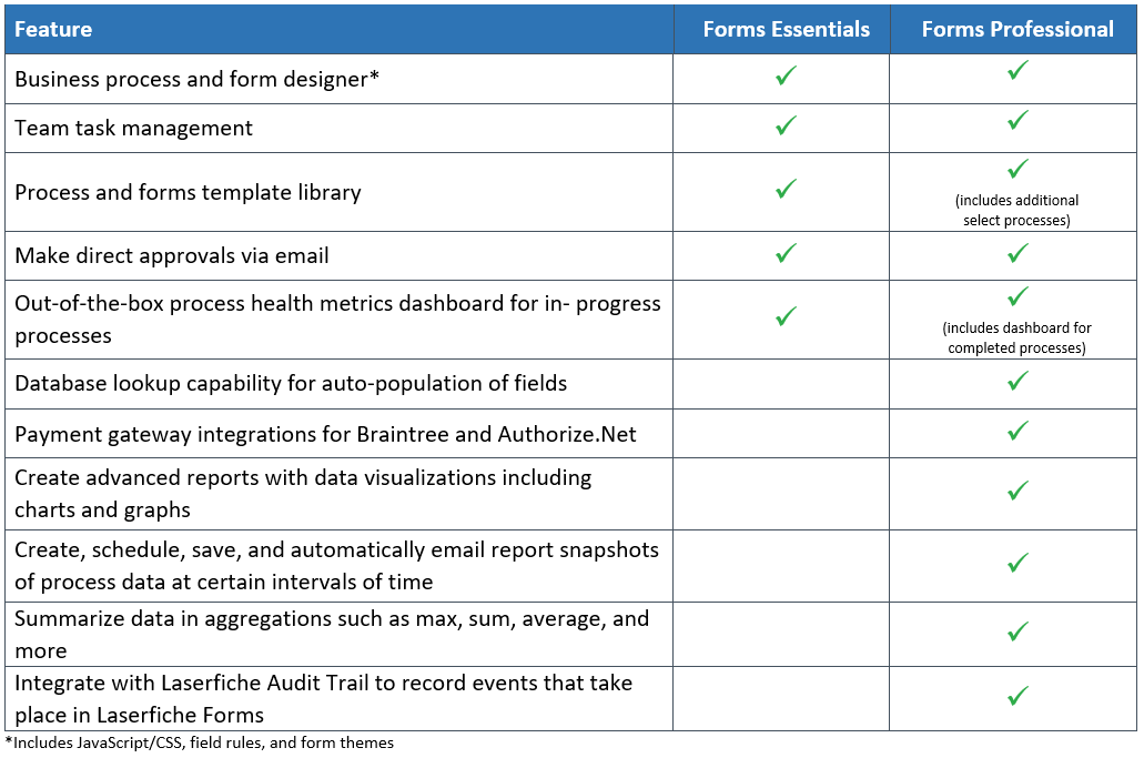 - Forms Essentials offers a limited feature set, where users have the core features of mapping out processes, creating forms and basic reporting. Forms Essentials is included with all Laserfiche installations that have Workflow and are on Laserfiche 10.2.1 and subsequent on-premises releases.