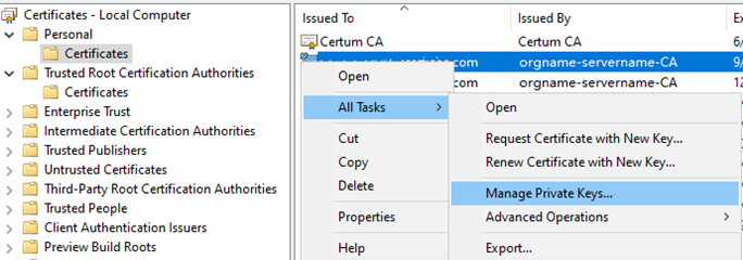 - In the Certificates (certmgr) mmc snap-in, expand Personal and select Certificates, then right click the appropriate certificate, select All Tasks and Manage Private Keys to access the user assignment area.