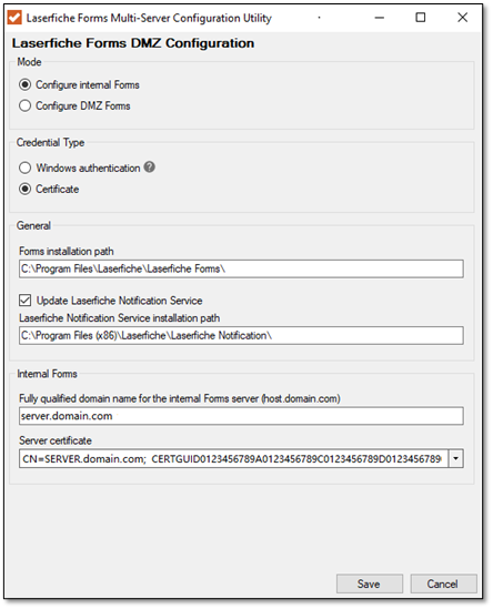 - Select the appropriate certificate prepared for the internal Forms server from the Server certificate dropdown.
