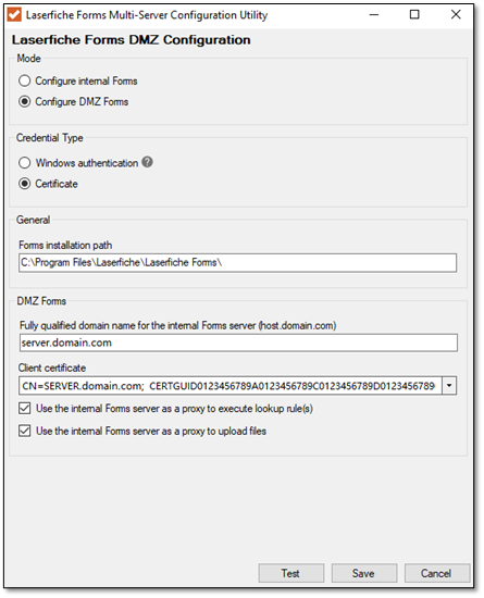 - Select the certificate prepared for the DMZ Forms server from the Client certificate dropdown.