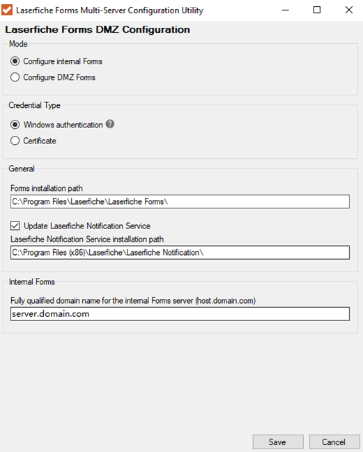- On the internal Forms server, open the FormsMultiServerConfigurationUtility.exe application located in the Forms\bin directory of the installation path. By default, this path is C:\Program Files\Laserfiche\Laserfiche Forms\Forms\bin\FormsMultiServerConfigurationUtility.exe.
