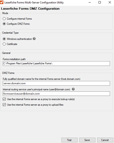 - Test connectivity between the DMZ Forms server and the internal Forms routing service by clicking on the Test button. Click Save to save your changes. The final configuration should resemble the example in the image below.