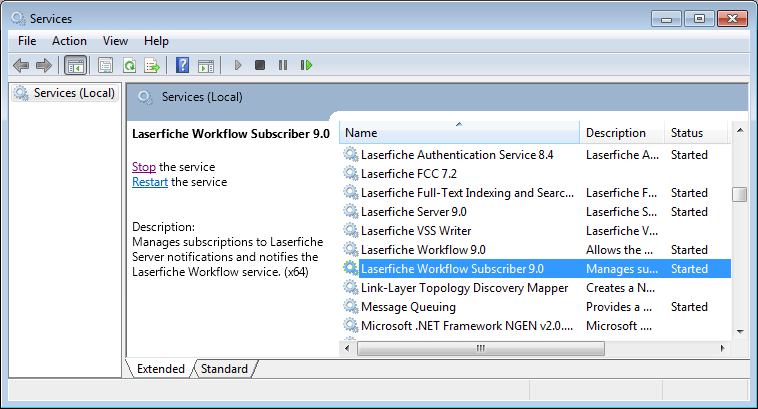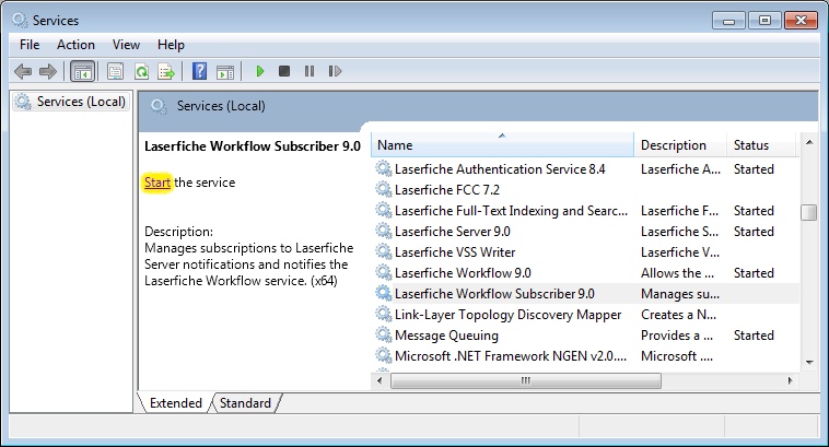 Name column, locate the Laserfiche Workflow Subscriber service. - Under the Status column, verify that the Laserfiche Workflow Subscriber service is Started. If the Status column is blank the service is not running, and you will need to manually start the service.