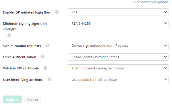 - Minimum signing algorithm strength: Specify the minimum signing algorithm strength for the SAML response sent to Laserfiche from your identity provider. It is recommended to use RSA-SHA256. SAML response signed by a weaker algorithm will be rejected.