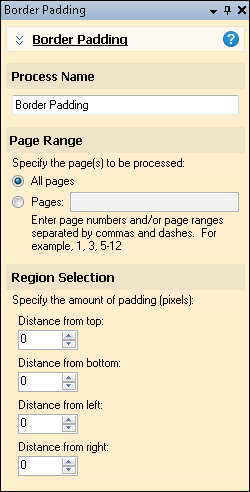 The Border Padding image enhancement adds a white border around the current image. Border padding increases the size and dimensions of the image. It does not scale or change the resolution of the image. The extra space created by Border Padding adds more room for stamps or other annotations added by a later process. You can specify the amount of space that will be added to each border. You can configure padding separately for each side: for example, you might pad the left and right sides of the image, but set the top and bottom to 0 to ensure those dimensions are not altered. The extra space added by Border Padding will always be white, so if you use it on a dark image and then invert the colors, you will end up with a dark border on a light image. To keep the border color consistent with the rest of the background, use Border Padding after Invert on a dark image.