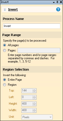 - Region Selection: Specify the region that will be inverted. You can invert the entire page or a selected region. To define a region, select Region and either drag and resize the zone on the Display Pane or specify coordinates in pixels or by percentage in the in the Tasks Pane.