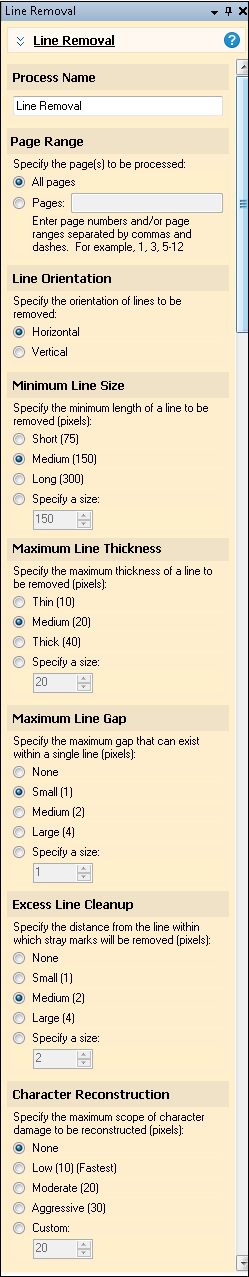 14. Character Reconstruction: Characters that intersect lines may be damaged during line removal. The Character Reconstruction option repairs any damaged characters. Specify the scope of character reconstruction. The numbers represent the maximum gap, in pixels, of a character disruption to be reconstructed.